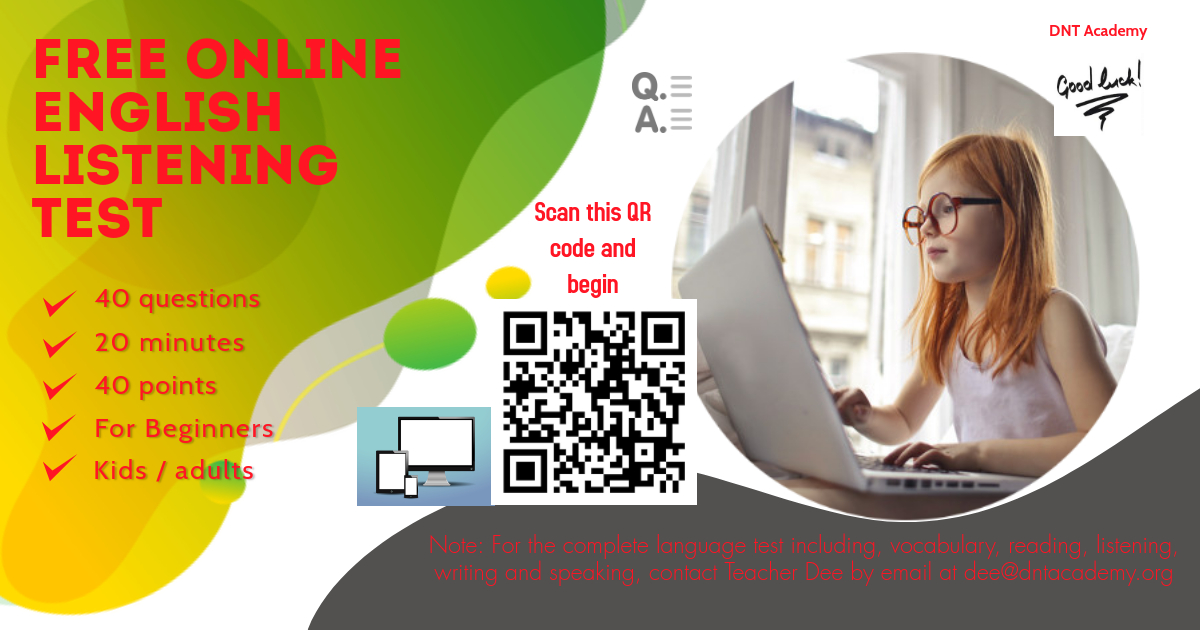 The DNT Academy ListeningBL test is for beginners learning English as a second language. The test has 40 questions of 1point each. The test must be completed in 20 minutes or else the page will automatically submit the work even if it is incomplete.